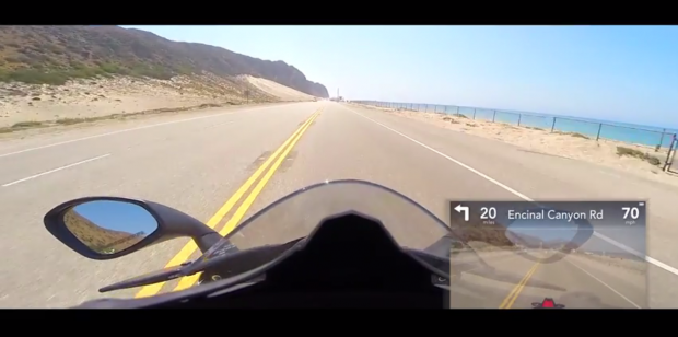 Esta pantalla como hemos comentado nos permite visualizar todos los datos sin tener que apartar nuestro punto de vista de la carretera, el casco cuenta con un dispositivo de localización, con lo cual en la pantalla se nos mostrarán datos de navegación GPS y a su vez una voz nos va señalando las maniobras a realizar durante el trayecto, también nos suministra información meteorológica a tiempo real y telemetría de la moto con datos como por ejemplo la velocidad.