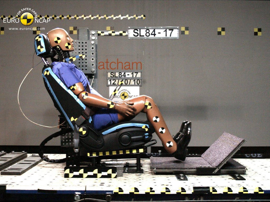Para esta prueba los asientos se extraen del vehículo y se instalan en una plataforma. Una vez allí se comprueba la eficacia de los reposacabezas a la hora de evitar el “latigazo cervical”, simulando un fuerte impacto en la parte posterior del vehículo, este apartado puede sumar hasta un máximo de 4 puntos. Esto representa los daños cervicales que afectan a más del 70% de los heridos.