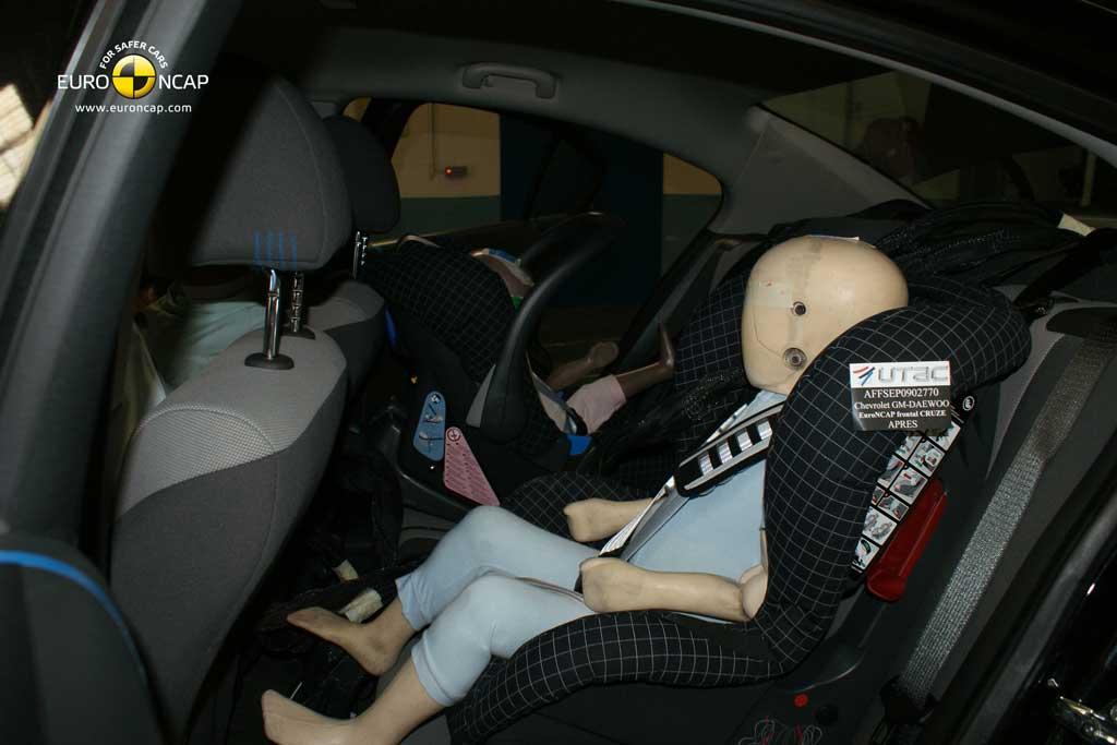 Tanto en el test frontal como en los laterales se colocan dos dummies en las plazas traseras que simulan la presencia de un niño de 1 año y medio y otro de 3 años en la sillita infantil recomendada por el fabricante para comprobar las probabilidades que tienen de impactar contra el interior del coche y la eficacia del sistema de retención.